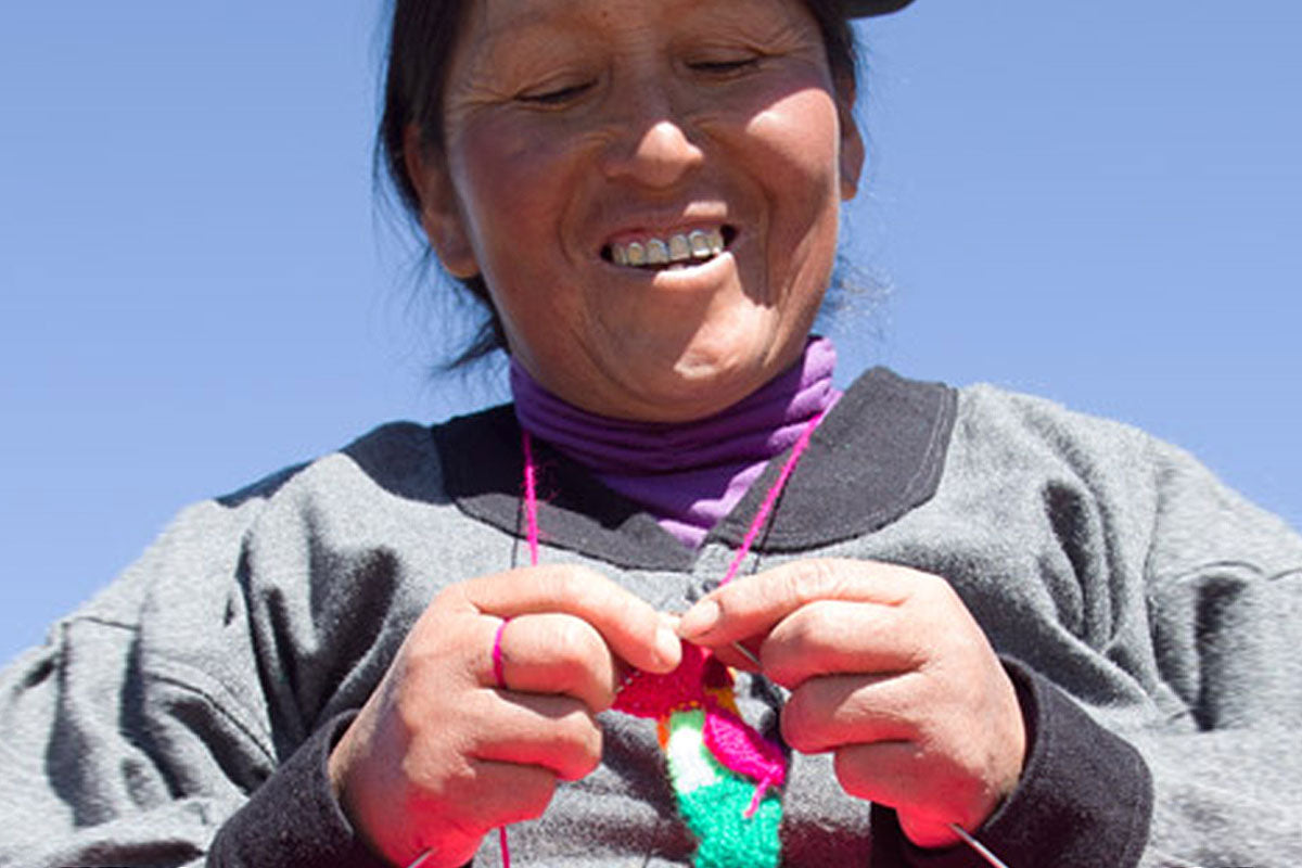 High in the Andes of Peru, on the shores of Lake Titicaca, knitting warm clothing has been a way of life for thousands of years. In these agrarian communities, girls and boys learn to knit while young. Today, knitting toys and ornaments allows creative women to earn supplemental income for their families.